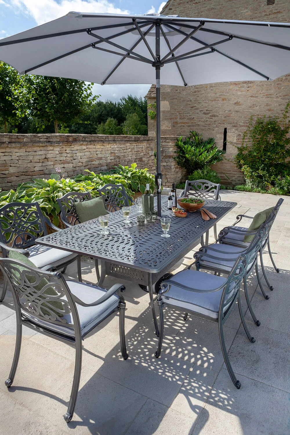 Whether you’re having a garden party, barbecue or just a relaxed day in the garden, the Hartman Capri 8 Seat Rectangular Dining Set is an ideal choice. It features a generously sized rectangular dining table, eight dining chairs, along with a 3m parasol with base. It has been stylishly finished with intricate designs on the chairs and table top, giving the set a decorative look that is sure to stand out in any outdoor setting.