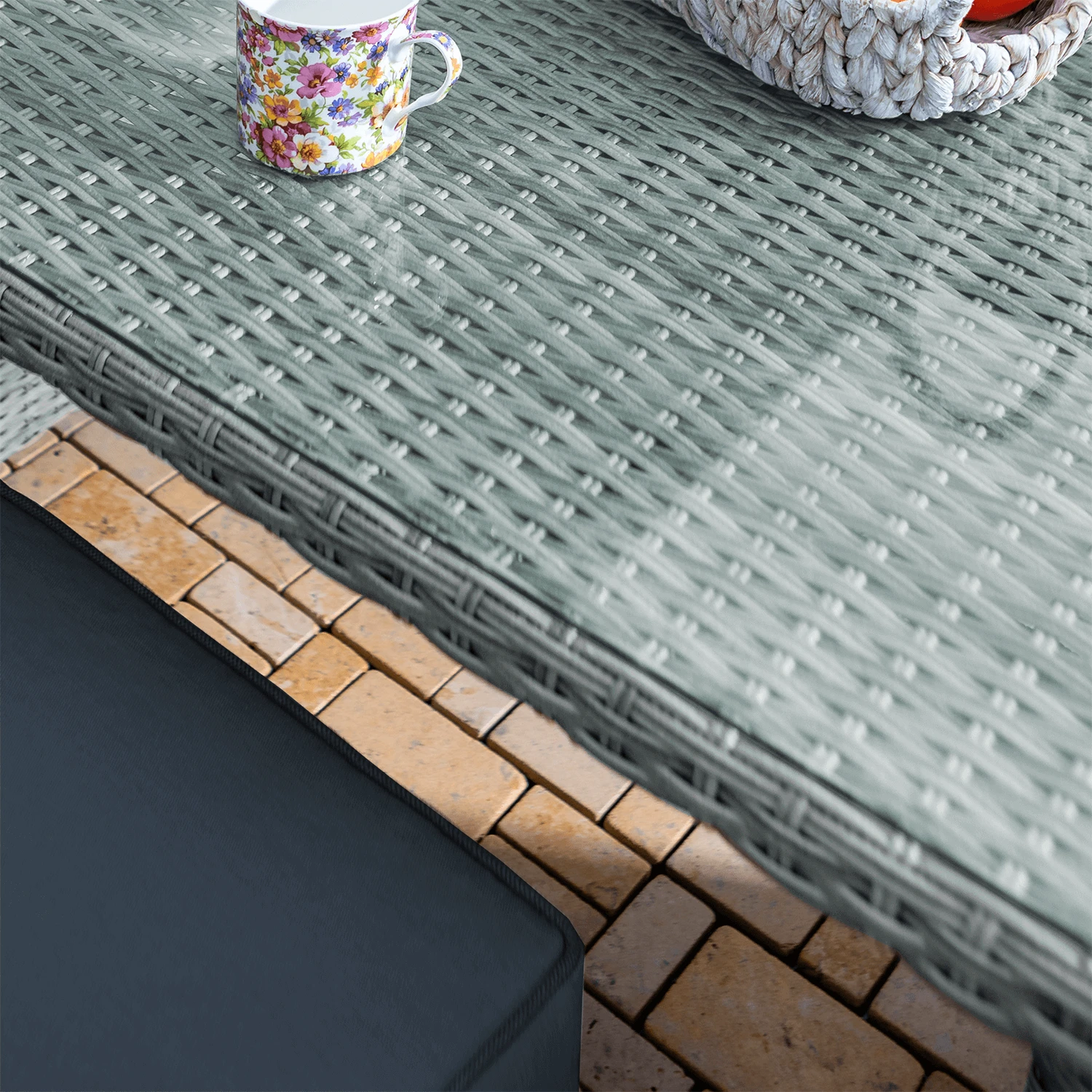 The set has traditional styling, featuring a double curve weave in a natural ash shade, and cushions in a complimentary slate colourway. The cushions are hard wearing as well as soft to the touch. They feature Weatherready fabric technology that is season-proof – they can be left outside all summer season without worry.