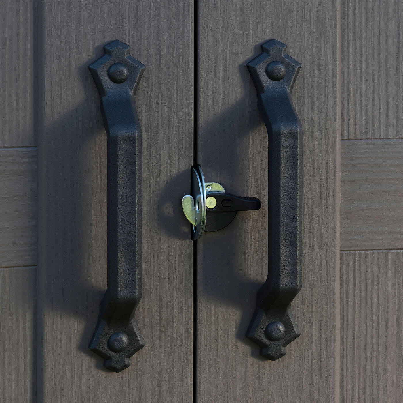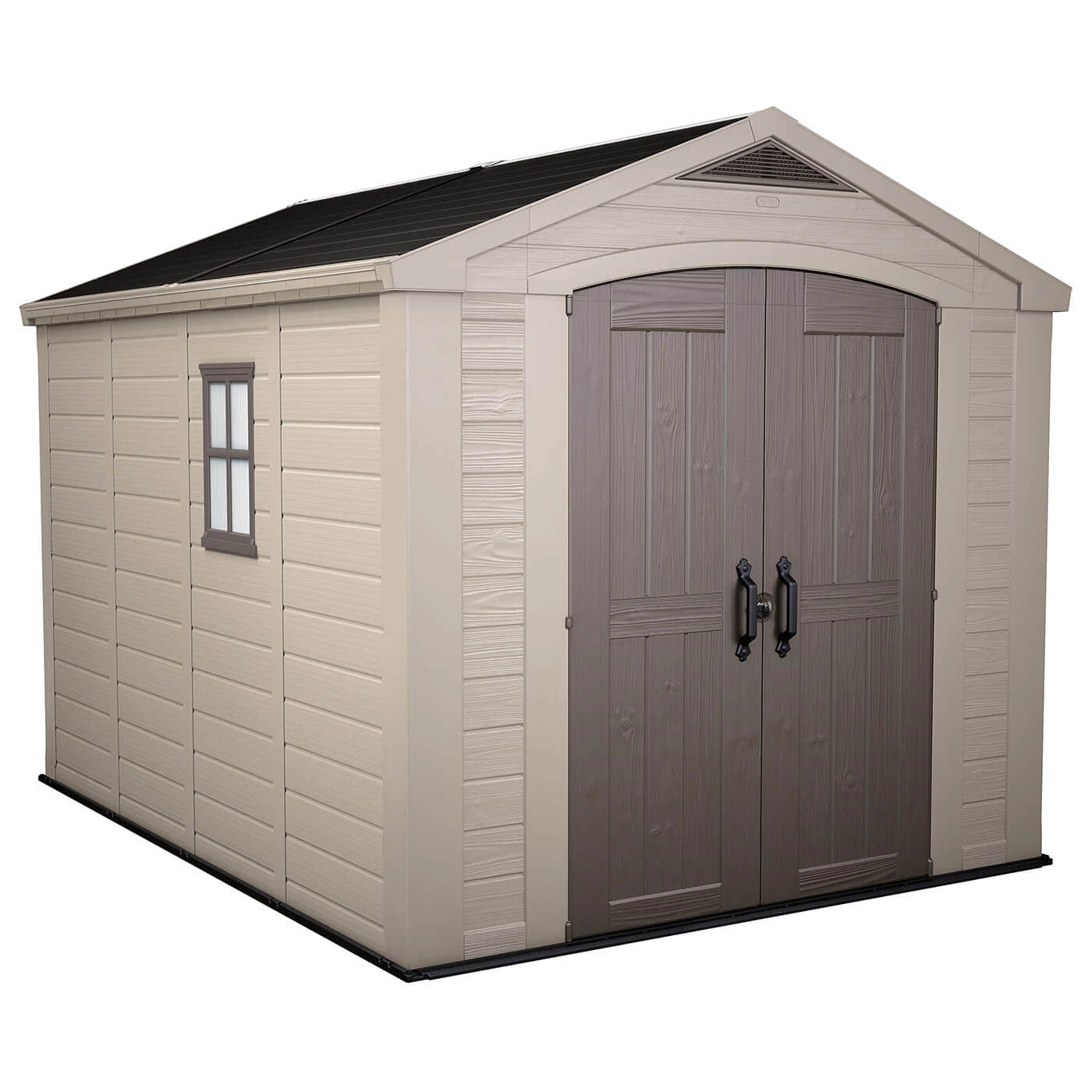 This elegant outdoor garden shed makes storing just about anything simple and elegant. The Keter 8 x 11 large apex resin shed is made out of a durable and weather-resistant resin that has a fine wood-like texture for looks and incorporates steel reinforcement for sturdiness.