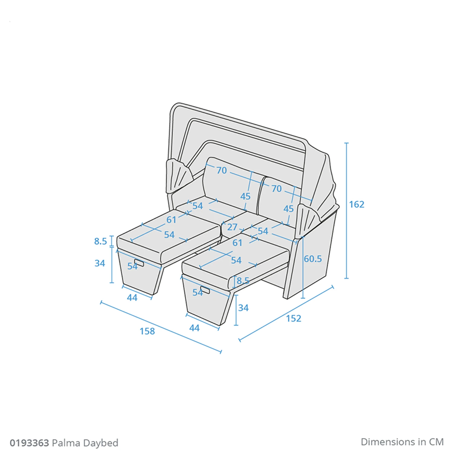 H162cm (when canopy is up) x L158cm x D152cm (when chairs are extended)
