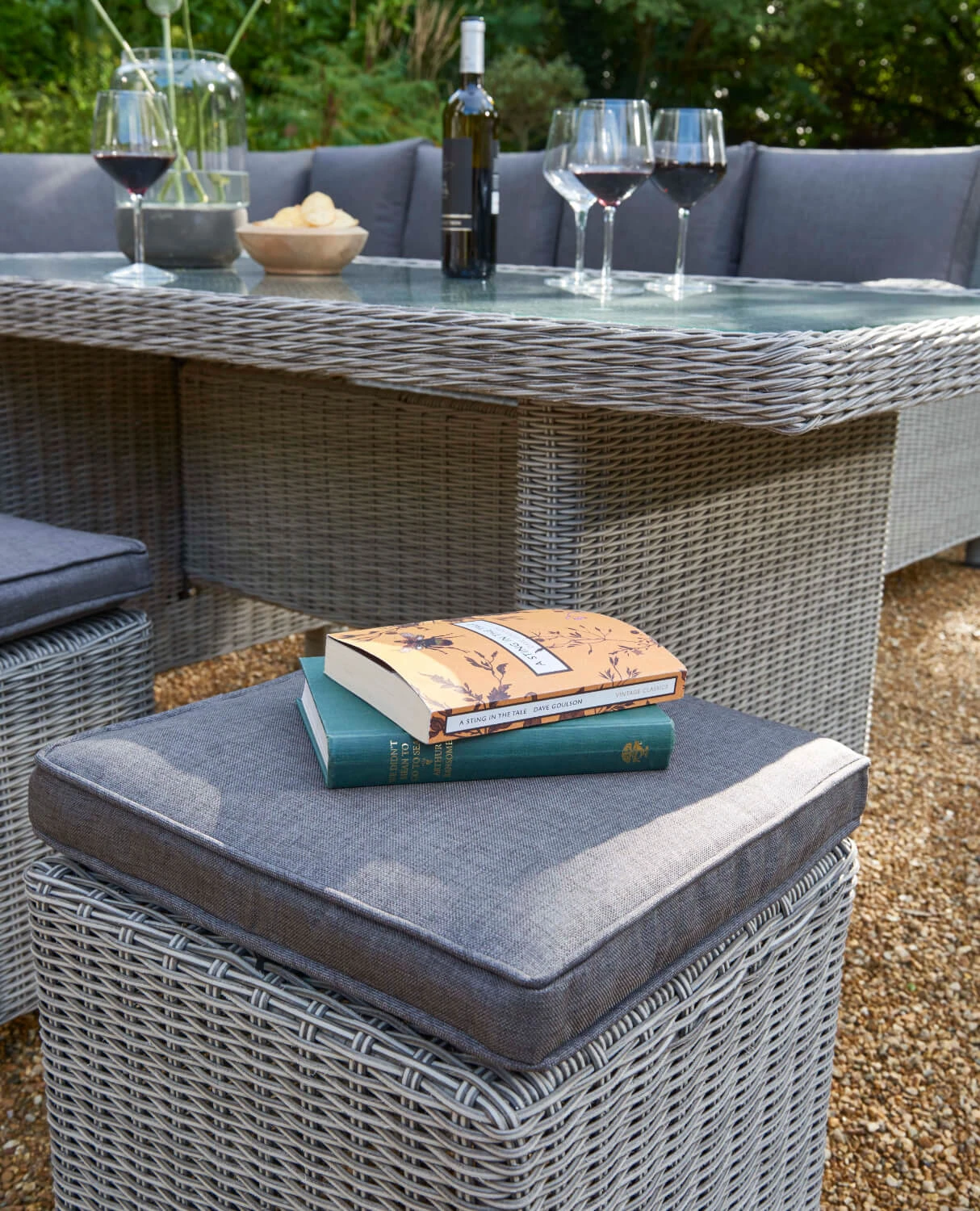 Create a relaxing corner in your back garden with the Kettler Palma Right Hand Corner Sofa Set – perfect for alfresco meals in the summer sunshine. This set consists of a corner seating unit in a right hand configuration, two stools, a glass topped dining table and can seat up to 8 people.