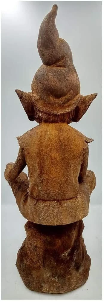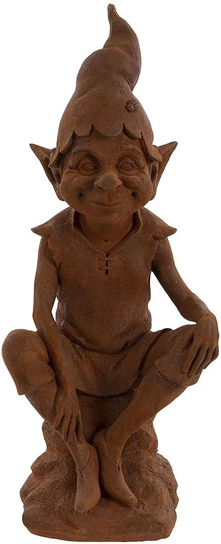 A great rust finish makes it look and feel like it was made of solid iron. Iron particles are suspended in a resin. The iron is most concentrated towards the outside of the pixie giving a pure iron coating. The sculpture is then rusted to make it seem like it has been in your garden (or where ever you decide to put it) for years and that it has really settled in.